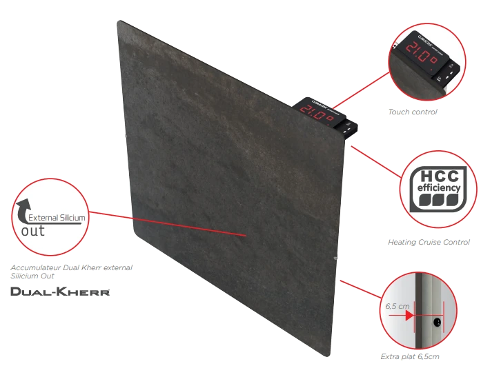 La chaleur douce et enveloppante de la fonte active gérée avec précision et économie est toujours présente. L’accumulateur extérieur Dual Kherr apporte inertie et améliore le rendement du sèche-serviettes.